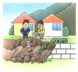 埋設されていた境界標が、土砂崩れ等の天災により見えなくなってしまった場合。埋設されていた境界標が、工事等で抜いたままになっていたり、本来あるべき位置と違う場所に戻されていた場合。このような時には、法務局備え付けの地図や市町村が保管する座標データ等に基づいた測量により、境界標を復元することができます。